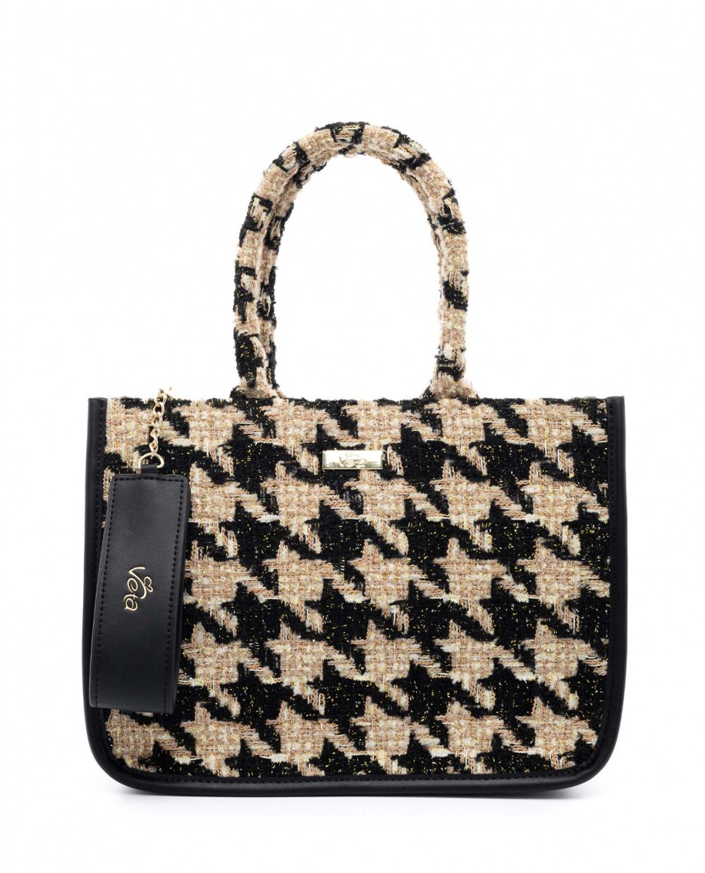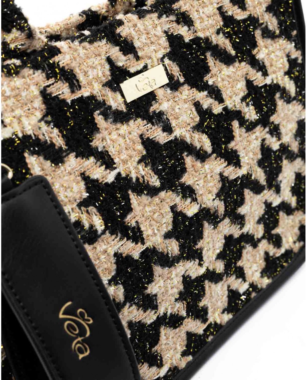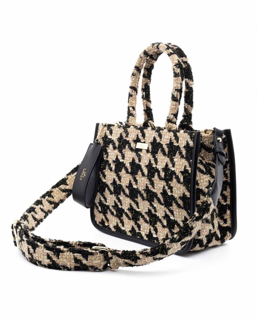 Χρώμα: Μπεζ - Μαύρο Υλικό: Ύφασμα ζακάρ - Οικολογικό δέρμα Κλείνει με φερμουάρ Συνοδεύεται με ιμάντα στο ίδιο μοτίβο. Περιλαμβάνεται προστατευτική θήκη ΕΣΩΤΕΡΙΚΟ 1 χώρος 1 τσέπη με φερμουάρ 2 ανοιχτές τσέπες ΕΞΩΤΕΡΙΚΟ Μεταλλικά στοιχεία light gold Διαστάσεις: Μ.: 27εκ./ Π.: 12,5εκ./ Υ.: 19.5εκ.