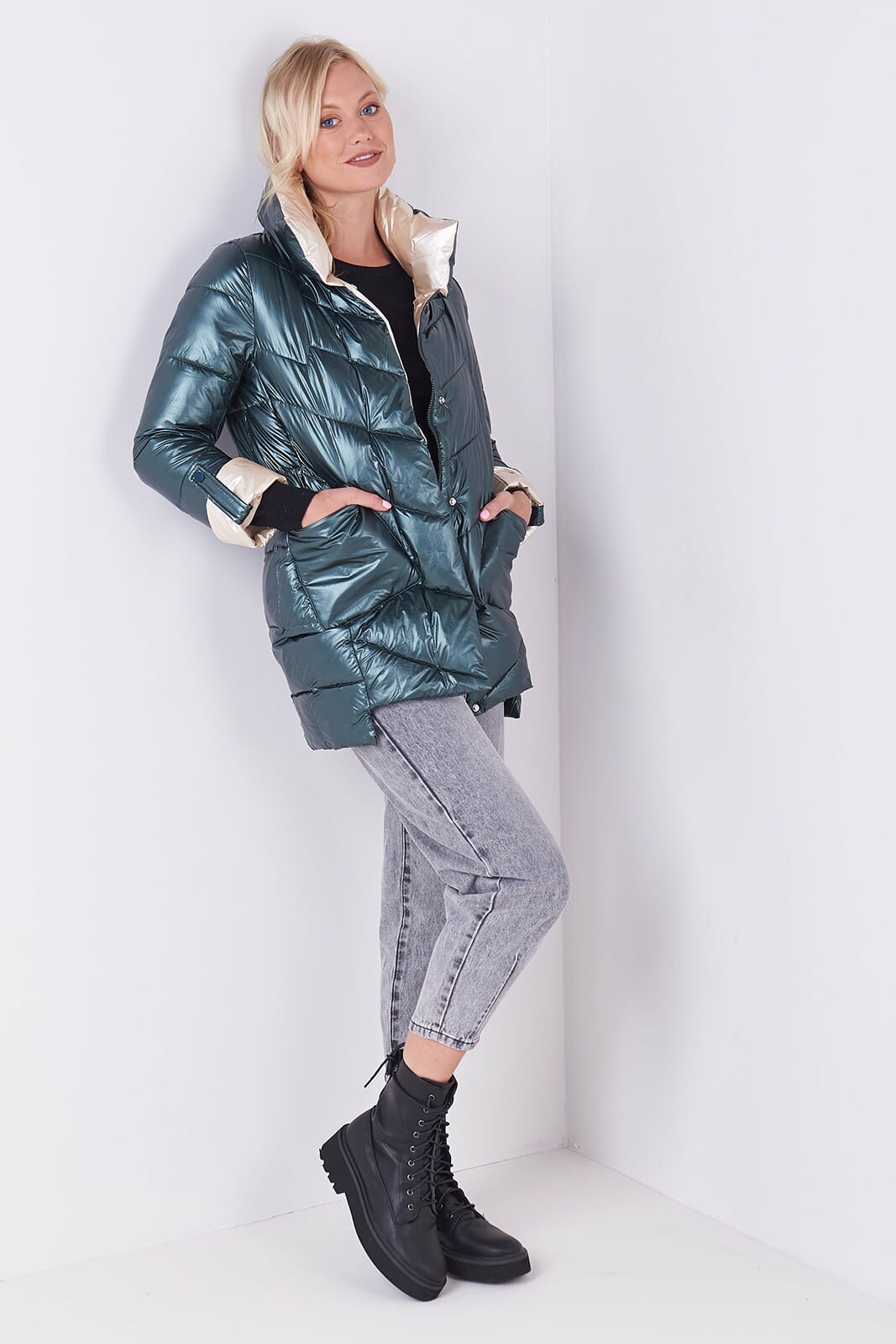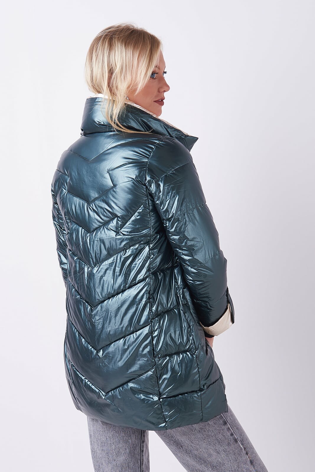 Puffer jacket with high neck and quilted design. Square pockets. Inner lining. Closes with zippers and hidden metal clips. Tight fit.