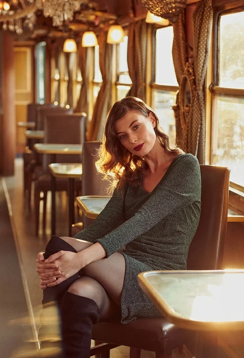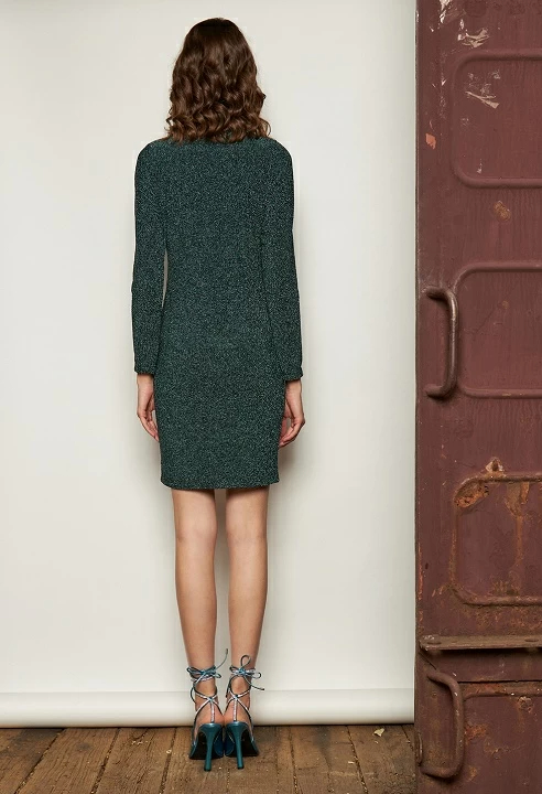 Short elastic dress, V-neckline cruise and long sleeve, drape fabric detail on the side, fitted line.