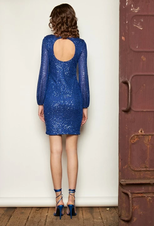 Round neck mini dress, long sleeve with elastic cuff, back opening detail and button and zip closure, inner lining, fitted line.
