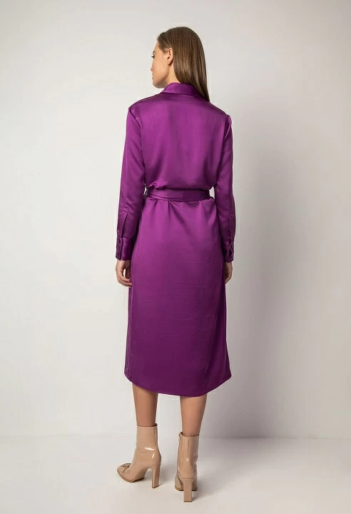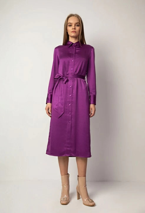 Dress with a shirt style collar, midi length, long sleeves ending in cuffs, button closure at the front and a matching belt at the waist, regular fit.