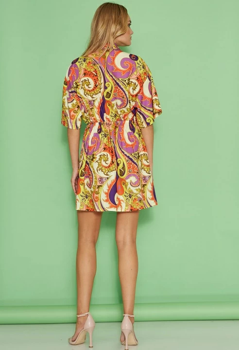 Μίνι φόρεμα με γιακά πουκαμίσου, κοντό μανίκι, η μέση προσαρμόζεται με κορδόνι, κλείσιμο με κουμπιά στο πάνω μέρος, κανονική εφαρμογή.