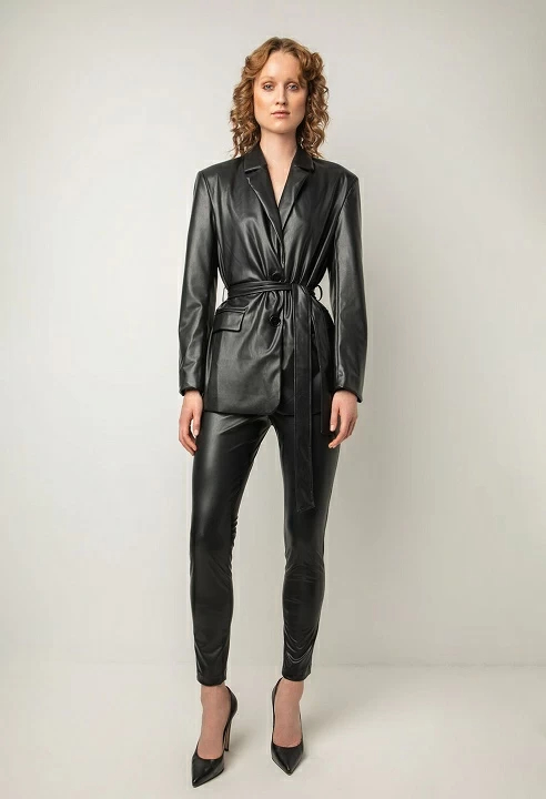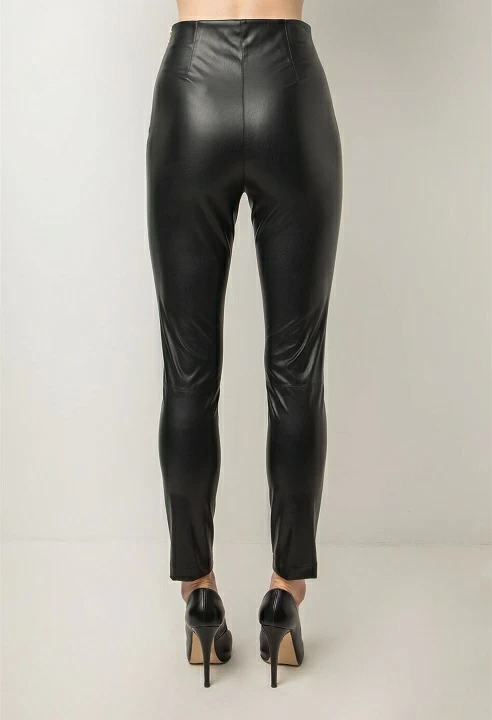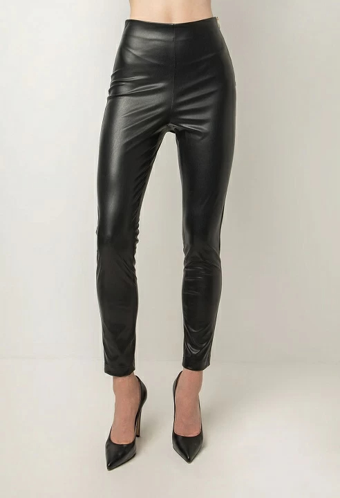 High waisted trousers, leather effect, gold side zip closure, regular fit.