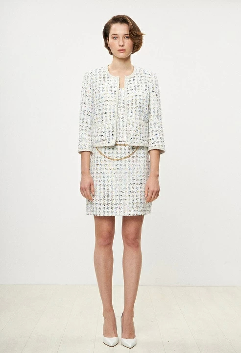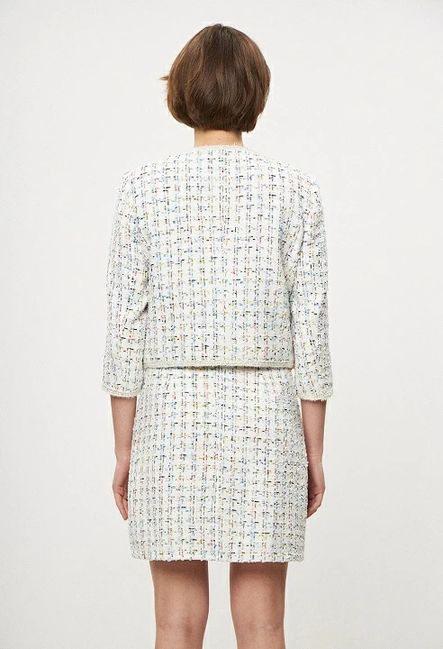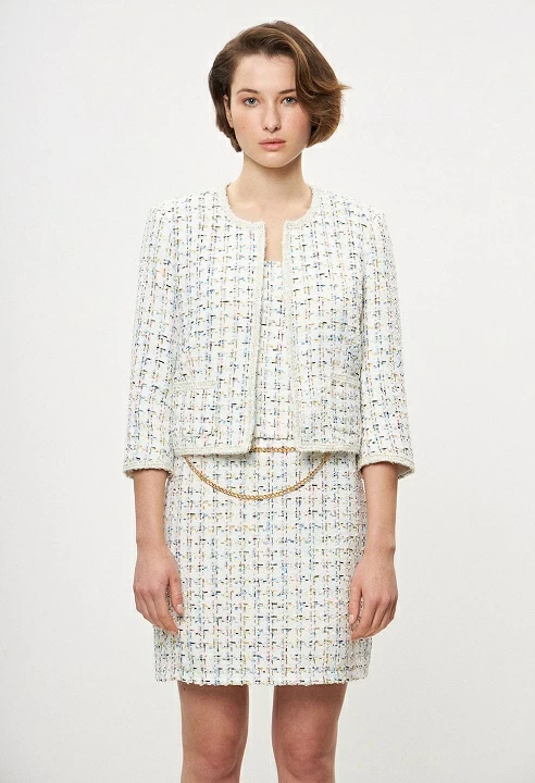 Collarless tweed jacket, tress detail, long sleeve and shoulder pads, inner lining, regular fit.