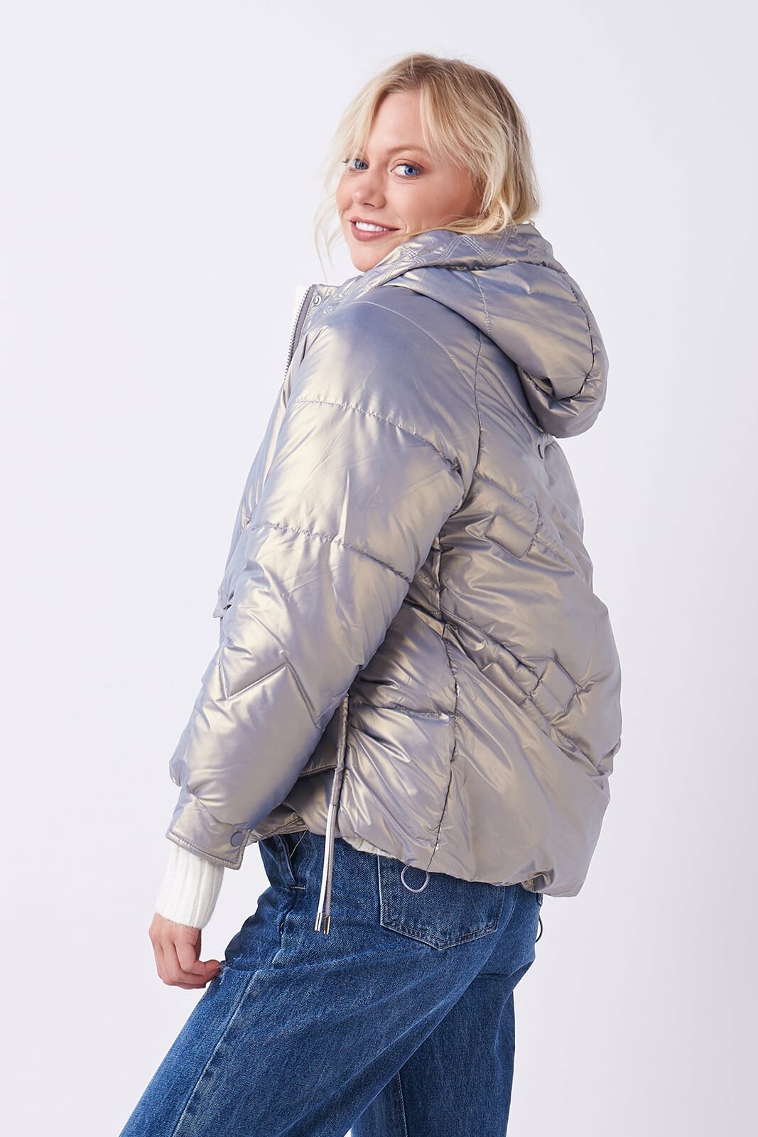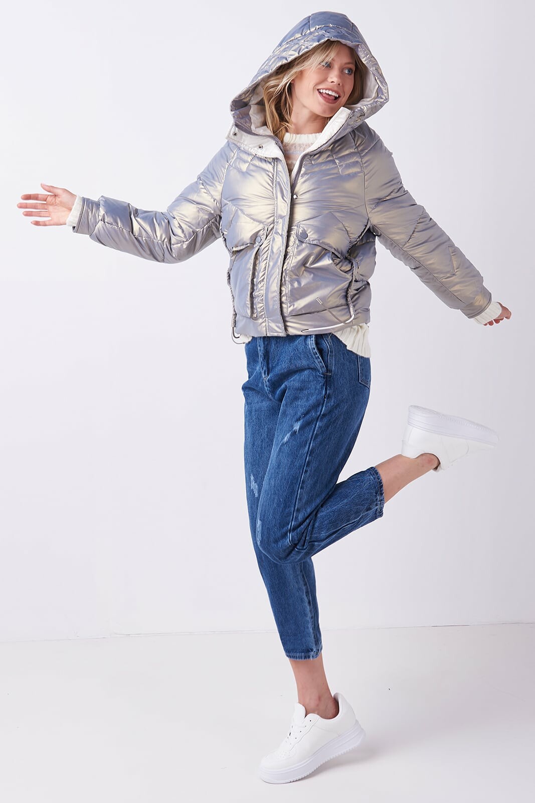 Μπουφάν puffer με κουκούλα. Καπιτονέ σχέδιο εξωτερικά. Γεωμετρικές τσέπες με κουμπί. Μακρύ μανίκι με μανσέτα και μεταλλικό κουμπί. Πλαινά κορδόνια που σουρώνουν και δημιουργούν σχέδιο.Κλείνει με φερμουάρ και μεταλλικά κλιπ. Στενή εφαρμογή.