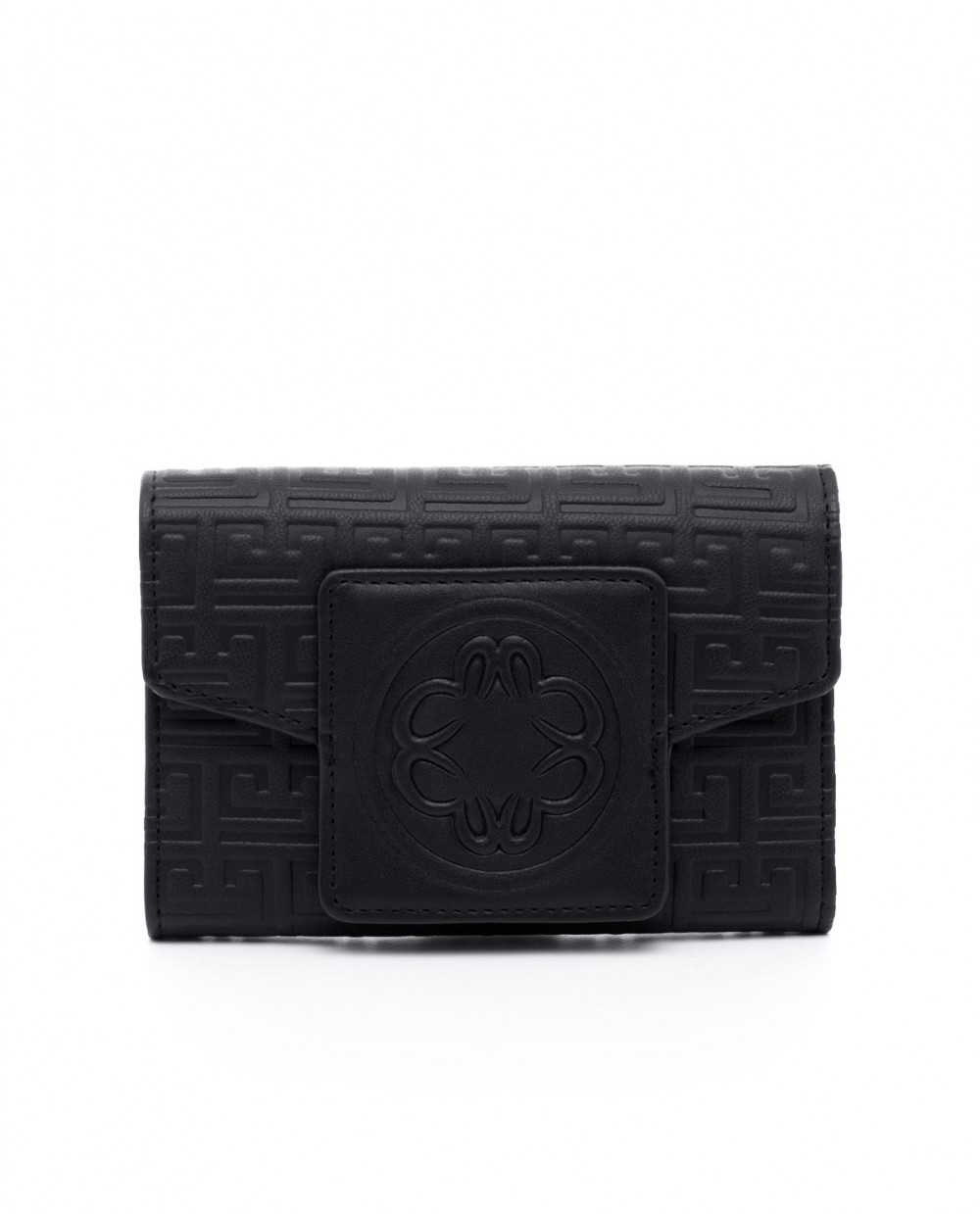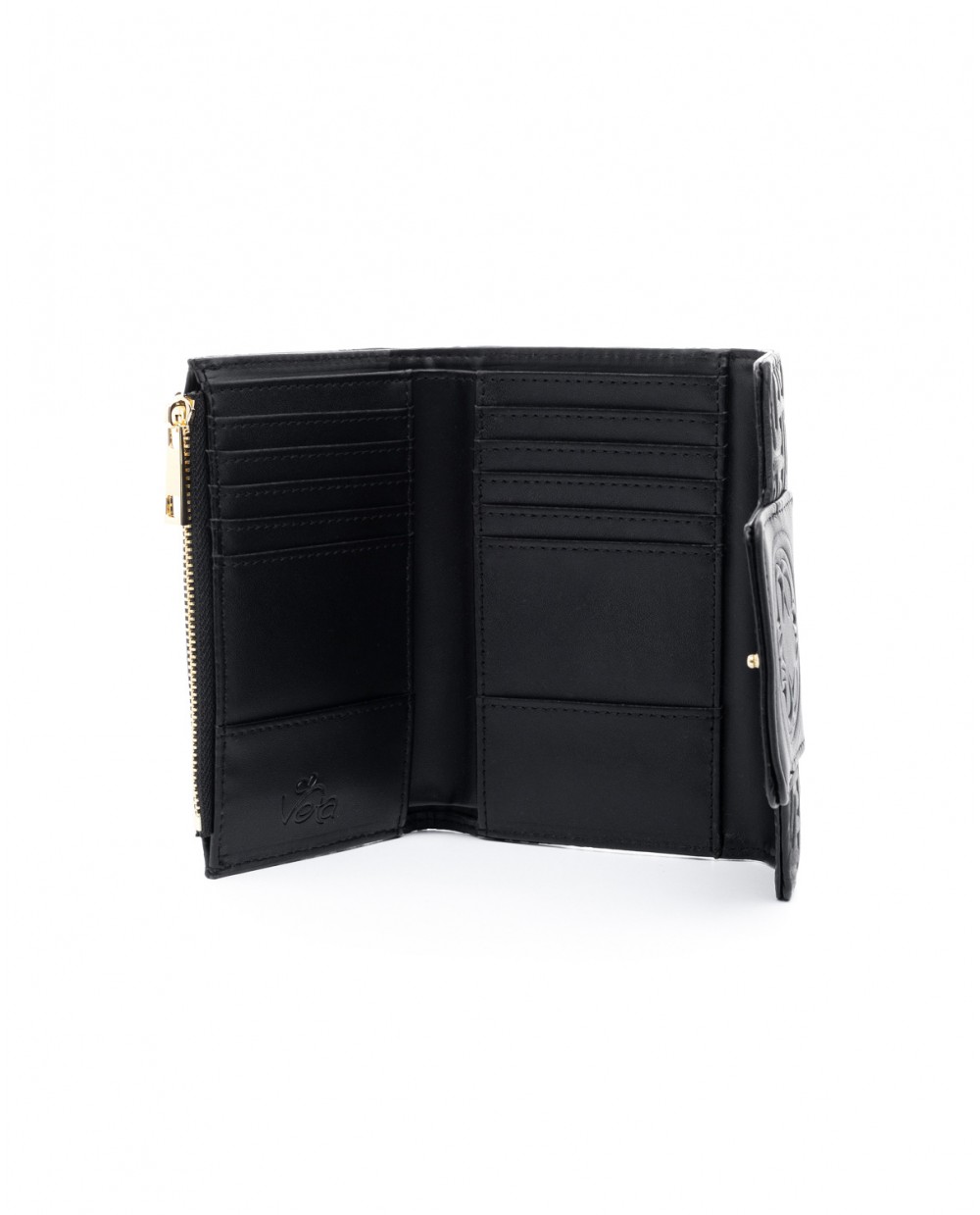 Χρώμα: Μαύρο Υλικό: Οικολογικό δέρμα Κλείνει με καπάκι Περιλαμβάνεται προστατευτική θήκη ΕΣΩΤΕΡΙΚΟ 1 χώρος 1 τσέπη για χαρτονομίσματα 1 τσέπη με φερμουάρ για ψιλά 12 Θήκες για κάρτες 2 θήκες ΕΞΩΤΕΡΙΚΟ 1 θήκη Μεταλλικά στοιχεία σε light gold Διαστάσεις: Μ.: 14εκ./ Π.: 2εκ./ Υ.: 9.5εκ.